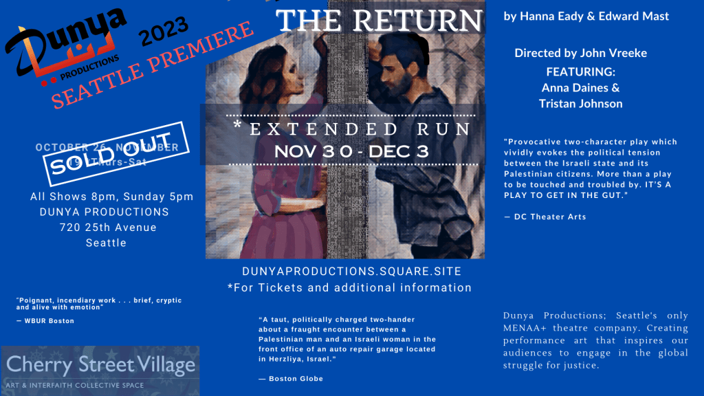 Dunya Productions, the MENA company in Seattle for which I am a founding company member and serve as Grant Writer, just closed a very successful run of The Return by Hanna Eady and Ed Mast, which was extended with a sold out run. I am thrilled to see Dunya thriving and growing as we work to renovate our space and keep presenting impactful work to the Seattle community.