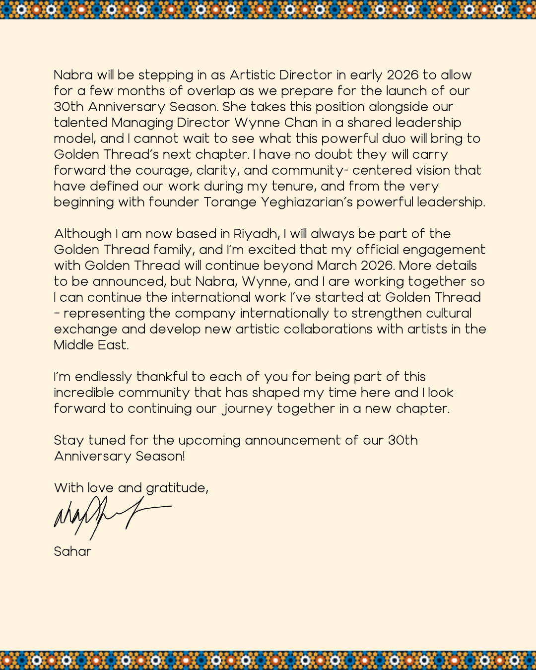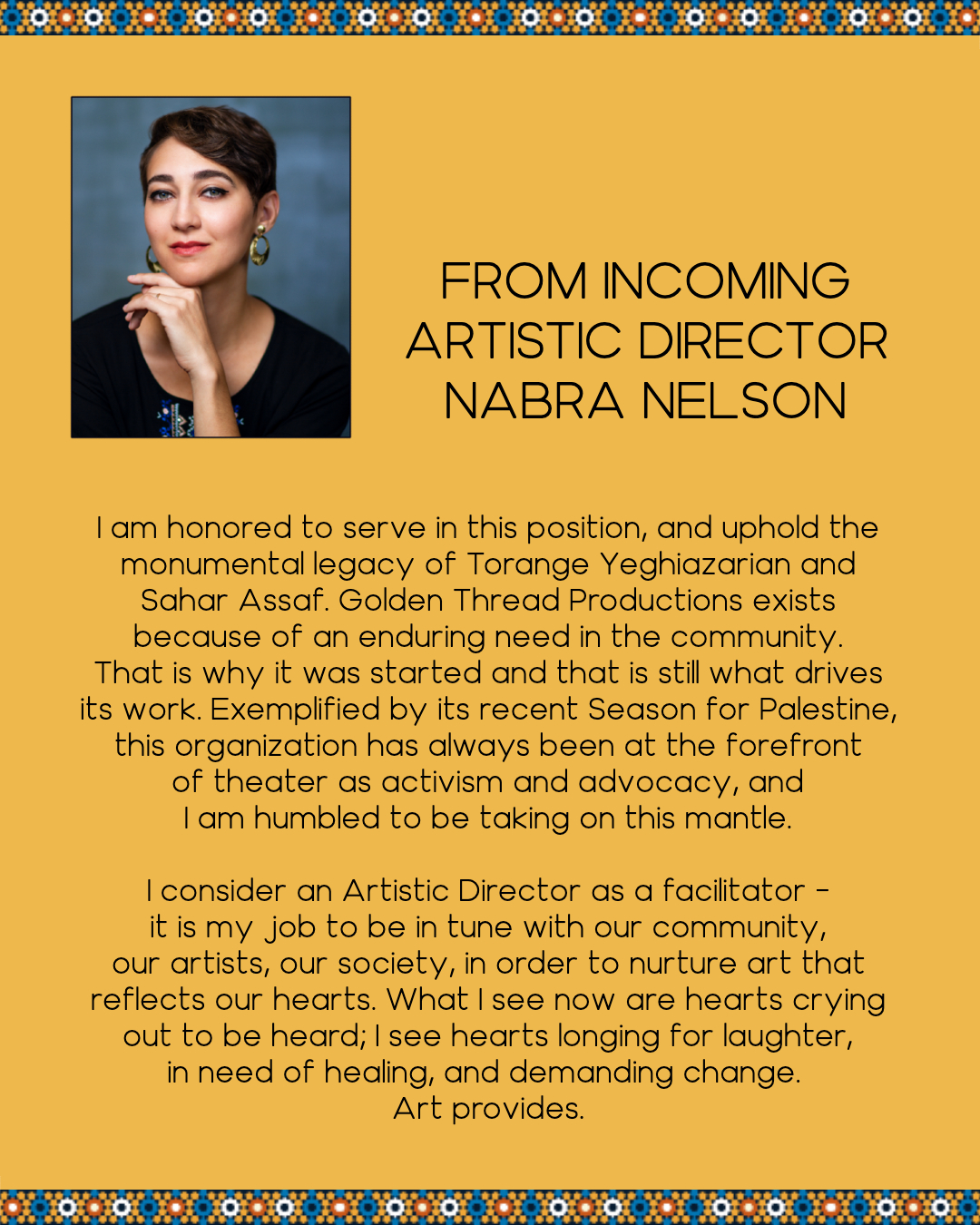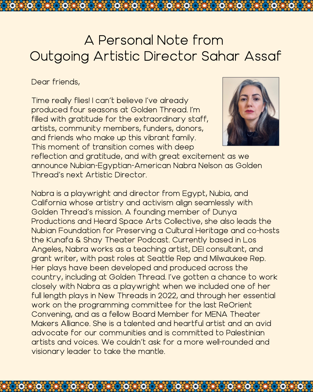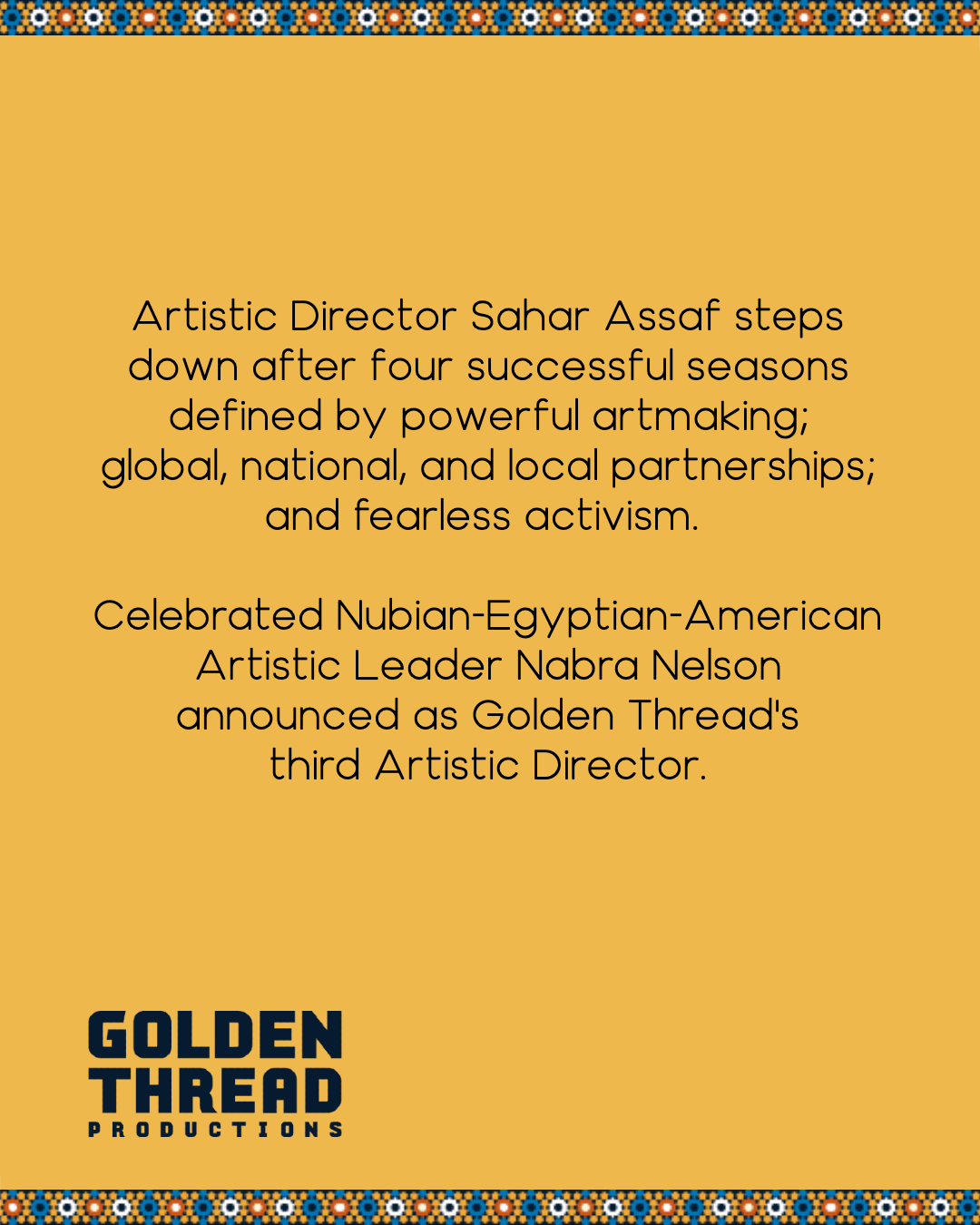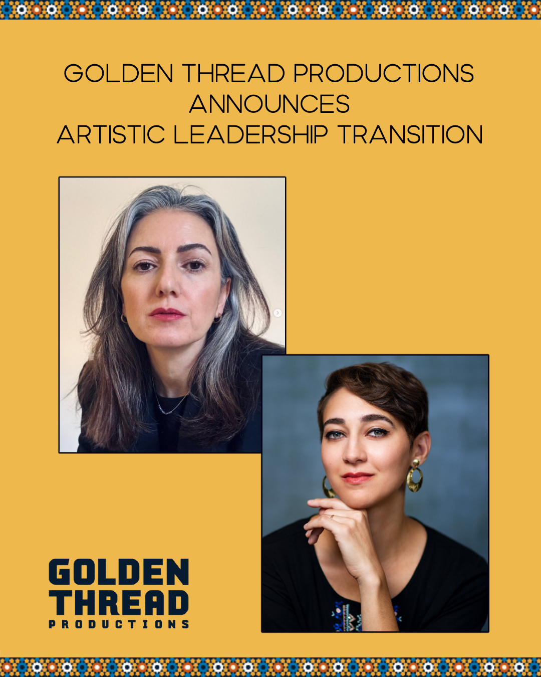 I am thrilled to announce my next exciting venture, as Artistic Director of Golden Thread Productions! Golden Thread is the oldest and largest Middle Eastern & North African theatre in the U.S., and I am very honored to be taking over leadership of this incredibly important institution.